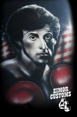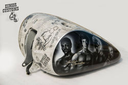 This Heritage softail project came from Gandhidham, Gujarat. The vision was to paint it in theme of Rocky Balboa (as in the iconic movie series "Rocky", from the seventies and eighties). Rocky's struggle to be a leading boxing champion and maintain the title/position for rest of the life is a brilliant inspirational story in itself. It reflects the struggle, sacrifice, hard work and true grit to get going! As we have limited surface on the body parts(one gas tank and two mudguards), we had to really dedicate a lot of time in story-boarding. It is very important not to lose the lines of the bike, without which the bike will look very bad after fitting, no matter how extra-ordinary the art-work is. We made signature heritage softail pattern with Black and Dirty white color. The black sections has proper Air brush portraits and scenes from movie, and the white portions carry Rocky's practice regime and punch lines from film. One side of the tank carries the portraits of opponents/fighters and other side carries the portraits of his support system and family! The front mudguard has all the iconic fighting scenes from the movie, Rocky-Apollo Creed, Rocky-Clubber Lang, Rocky-Draga. The rear mudguard carries the image of his statue in Philadelphia.
