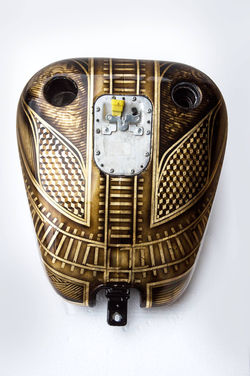 Royal Enfield Classic Petrol Tank having a granite finish. Each element in the work has been painstakingly done. The relief and the patterns are inspired from great Ancient Indian Temple Architecture. Great attention to detail has been given to give an appearance of stone carving.